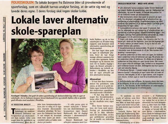 Et glimrende initiativ - fordi man her gør noget aktivt og konstruktivt for at finde en løsning. Ikke noget med demonstrationer og læsebrevsstorme fra et borgerligt læserbrevsteam og grædende børn og hundehvalpe og skilte og balloner. De to kvinder mener dog man skal spare 15% på Centraladministrationen og mener dette kan ske ved omlægning af arbejdsrutiner og optimering af arbejdsgange. Det er noget af en udmelding, at man skal fyre omkring 15% af det administrative personale. Der er 8.000 medarbejdere ansat i kommunen, så der er jo nogen at tage af - de er nu ikke alle ansat i administrationen. Underligt at man vil bevare de små skoler, ved at fyre personale i administrationen. Spareforslagene lider af den kvalitetsmæssige mangel, at de ikke er operative (til at styre efter) - det er kun politiske slagord. Mange af forslagene er dog allerede nævnt i turnusanalysen. Den største mangel ved forslagene er, at man ikke får løst problemet med for mange skoler til for få børn. Det er jo kerneproblemstillingen. Det er lige så vigtigt at samle eleverne på tilstrækkeligt store skoler, så man har mulighed for at give børnene undervisning af specialskolelærere i visse fag. Deres spareforslag om administrationen ligner præcis det som V-K-O også meldte ud til budgetforhandlingerne. Det kan man tage hatten af for - og man kan konstatere, at den lukningstruede Flakkebjerg Skole er taget af "dødslisten".