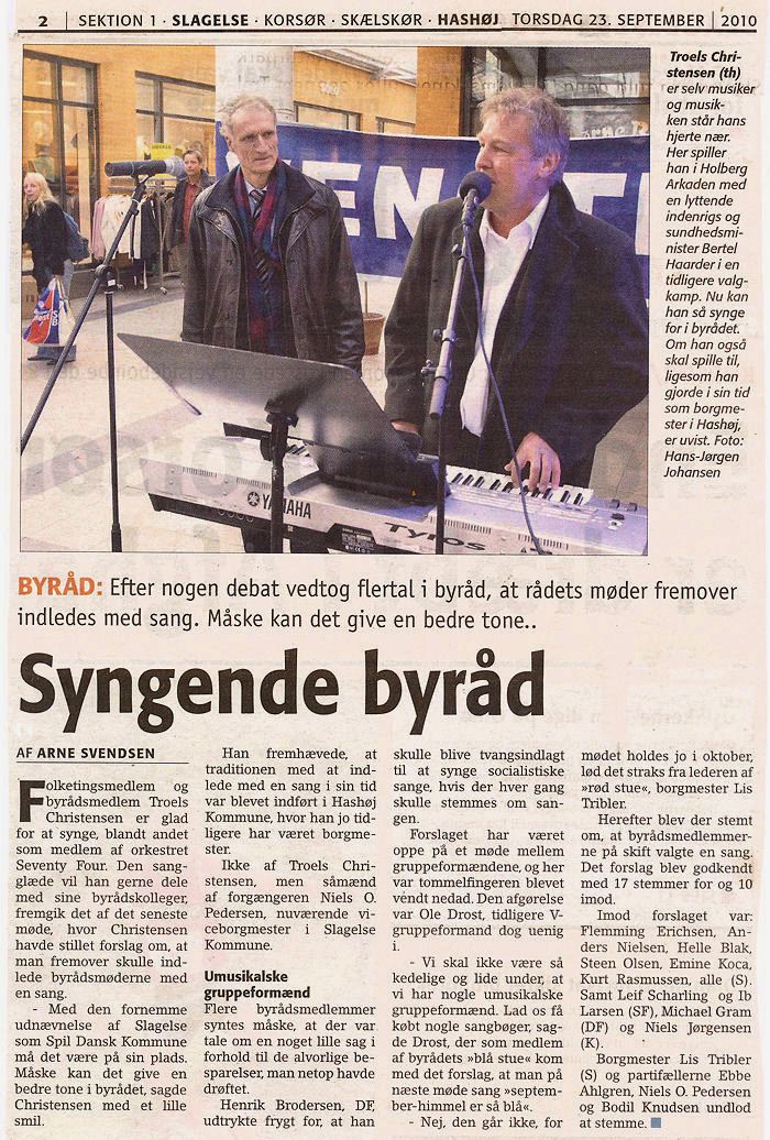 MIDT I HELE "VALGKAMPEN" HAR VOR LOKALE MAND TROELS CHRISTENSEN, DER ER MEDLEM AF FOLKETINGET, SLAGELSE BYRÅD OG SELVFØLGELIG VOR FORENING - FÅET DEN IDÉ AT BYRÅDSMØDERNE SKAL INDLEDES MED EN SANG. DET ER VI SIKRE PÅ, AT DER KAN BLIVE MEGET SPAS UD AF. HVAD MED "DEJLIG ER DEN HIMMEL BLÅ" ELLER "SOLEN ER SÅ RØD MOR"? NU SKAL DER INDKØBES SANGBØGER OG SÅ GÅR DET PÅ SKIFT MELLEM BYRÅDSMEDLEMMERNE AT VÆLGE EN SANG. MON TROELS GIVER MUSIKLEDSAGELSE PÅ SIT LÆKRE ORGEL. DET ER DA ET FESTLIGT PÅFUND.