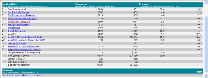 Ved at klikke her får du ovenstående tabel op i et nyt vindue - her er alle tal om sidste kommunevalg i NySlagelse kommune. Her kan du se stemmeafgivningen på de enkelte valgsteder og antallet af personlige stemmer og bevægelser i forhold til foregående kommunevalg. Valget i 2005 var dog atypisk.